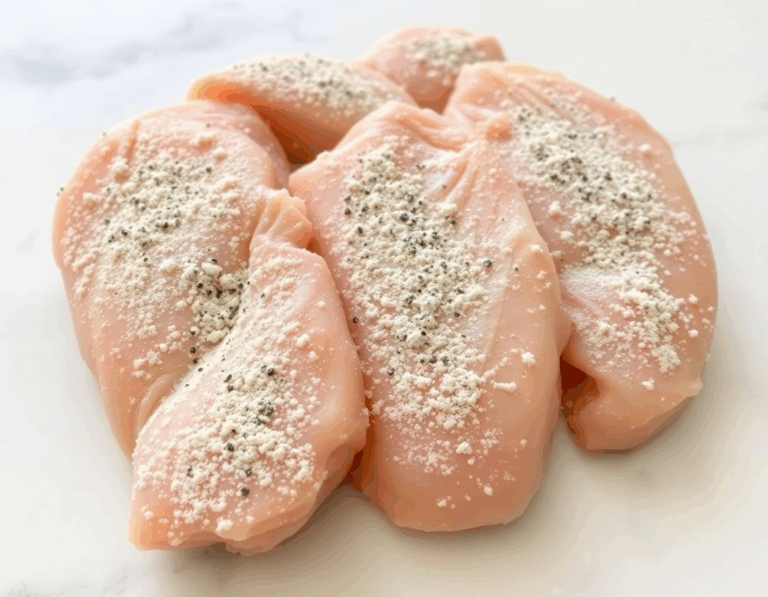 - Slice the chicken breasts in half horizontally to create four thinner pieces. Season with salt and pepper, then coat them with flour.